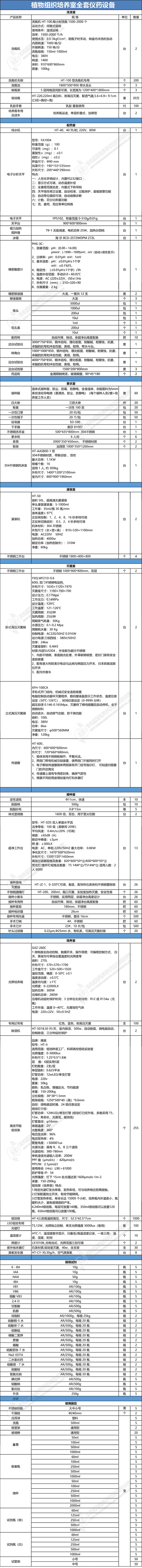 植物組織培養(yǎng)室全套儀藥設(shè)備稱量、配藥室設(shè)備產(chǎn)品名稱規(guī)格價(jià)格單位數(shù)量合計(jì)純水機(jī)HT-40,40升/時(shí),220V,80W,外型5200臺(tái)15200精密移液器大龍,一套共10支2000套24000移液器架大龍80個(gè)2160吸頭5000ul90包1901000ul30包130200ul20包24010ul15包230吸頭盒1ml10個(gè)220200ul10個(gè)22010ul10個(gè)220磁力加熱攪拌...