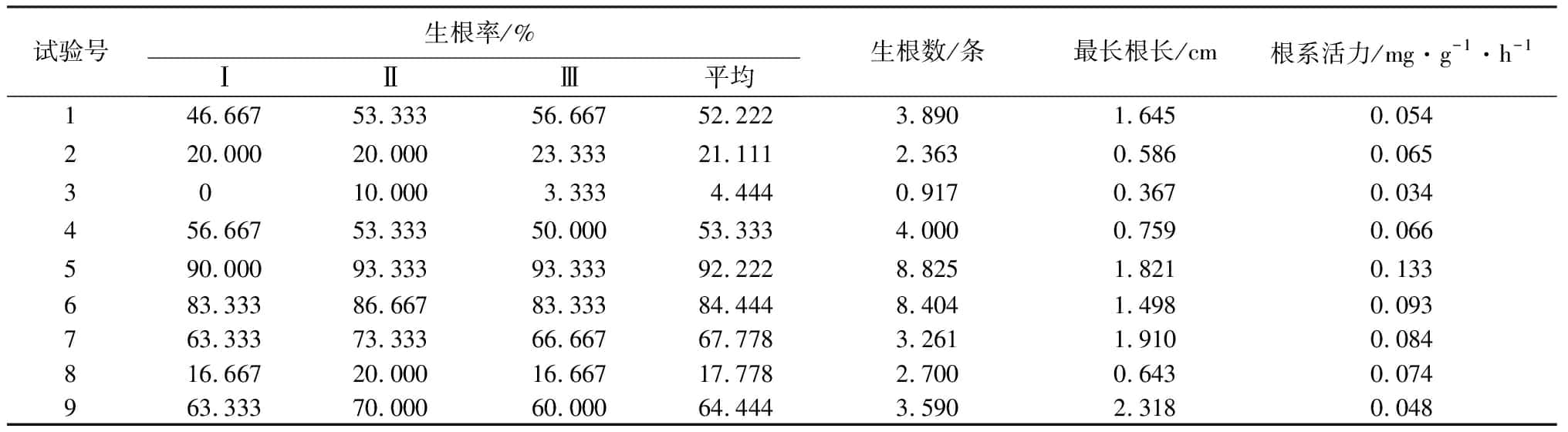 將基質(zhì)裝入49 cm×19 cm×13 cm的長形花盆中,選擇生長健壯、長勢一致的增殖苗,用剪刀剪去芽苗根部膨大部分,清水清洗根部,剪成長度約為3cm的莖段,根據(jù)試驗設(shè)計分別對其進行生長調(diào)節(jié)劑處理,處理結(jié)束后用鑷子將組培苗基部插入基質(zhì),深度為0.8~1.0 cm,覆蓋薄膜保濕,膜內(nèi)濕度保持在80%左右。置于溫度25℃、光照2000~2 500 lx、光周期16 h的環(huán)境條件下培養(yǎng),處理30d后調(diào)查統(tǒng)計各處理的生根率、生根數(shù)、很長根長,并進行根系活力的測定。