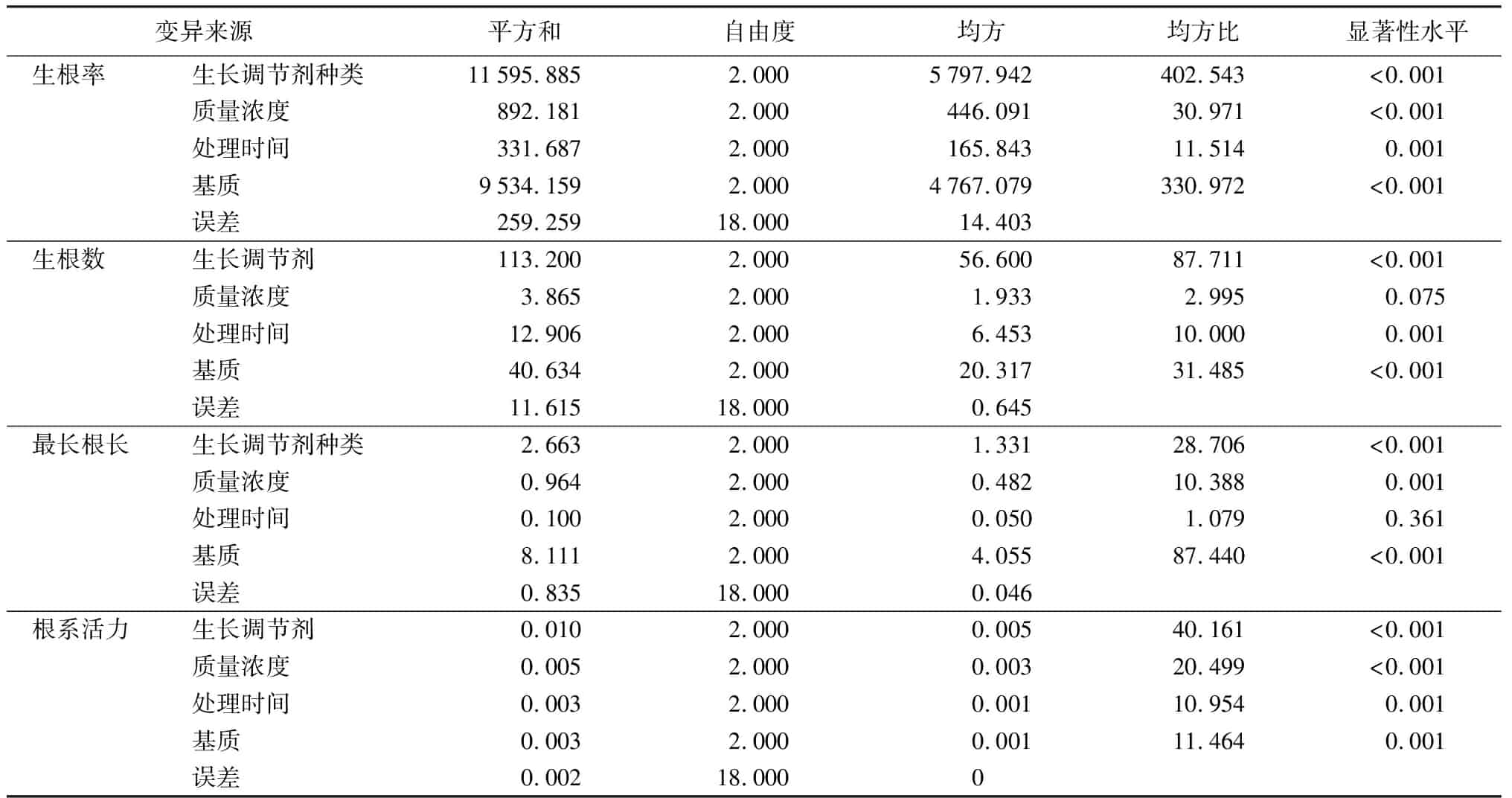 在根系活力方面,各處理因素下組培苗根系活力均方比由大到小順序為生長調(diào)節(jié)劑種類、質(zhì)量濃度、基質(zhì)、處理時間,4個因素對根系活力皆有顯著影響(P<0.05)(表4)。