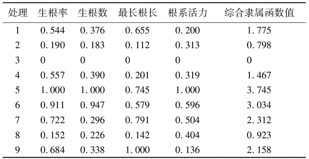 利用SPSS16.0軟件和Excel 2003對所測數(shù)據(jù)進行方差分析和多重比較,通過隸屬函數(shù)法對生根效果進行綜合評價。