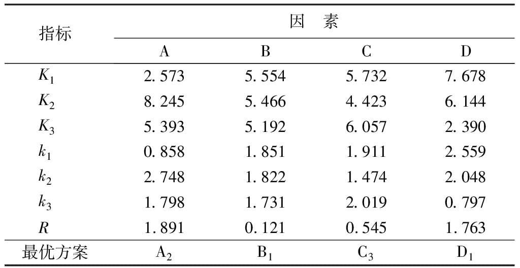 注:K為不同處理中各個因素對應(yīng)的各個水平的數(shù)值之和;k為K的平均值;R為極差。