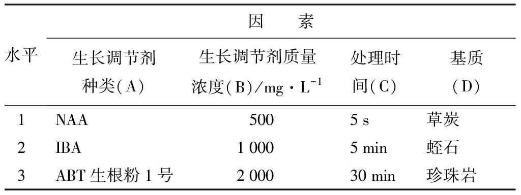 試驗材料為江蘇省林業(yè)科學院提供的輪生冬青‘奧斯特’組培苗。參考課題組前期對于烏飯樹組培苗瓶外生根的研究以及在衛(wèi)矛組培技術(shù)研究中的試驗設(shè)計,采用L9(34)正交表,設(shè)置生長調(diào)節(jié)劑種類、質(zhì)量濃度、處理時間和基質(zhì)4個因素,每種因素3個水平,不考慮交互作用(表1)。隨機以50根插穗為1個處理,共有9組處理組合,重復(fù)3次。