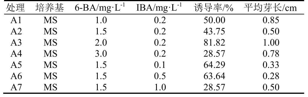 1.2.3 生長調(diào)節(jié)劑配比試驗 將消毒外植體接種到按單因素多水平設(shè)計的不同生長調(diào)節(jié)劑配比的、添加0.5 g·L-1活性炭的MS培養(yǎng)基中,共計7組,分別為:IBA為0.2 mg·L-1,6-BA分別為1.0、1.5、2.0、3.0 mg·L-1;6-BA 為 1.5 mg·L-1,IBA 分別為 0.1、0.2、0.5、1.0 mg·L-1 (表 1)。每組 15 瓶,每瓶接 1個外植體,每3 d觀察1次,15 d統(tǒng)計誘導(dǎo)情況。