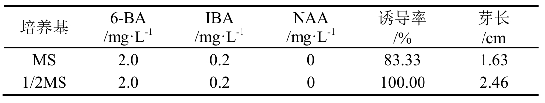 從表2可知,當(dāng)生長調(diào)節(jié)劑配方同為6-BA 2.0 mg·L-1,IBA 0.2 mg·L-1時,1/2MS 培養(yǎng)基比MS培養(yǎng)基的誘導(dǎo)率高,達(dá)100%,平均芽長也較長,達(dá)2.46 cm。因此,較適合葉下珠莖段誘導(dǎo)芽的培養(yǎng)基配方為 1/2MS +6-BA 2.0 mg·L-1 + IBA 0.2 mg·L-1 + 瓊脂7.5 g·L-1 + 蔗糖 30 g·L-1 + 活性炭 0.5 g·L-1。