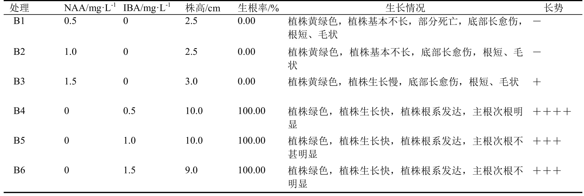 注:基本培養(yǎng)基為1/2MS;“-”表示差,“+”表示一般,“++”表示好,“+++”表示較好,“++++”表示好。