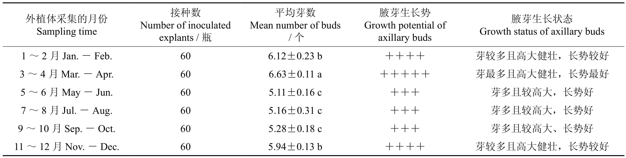 表1 外植體的不同采集時(shí)間對(duì)其腋芽萌發(fā)的影響?