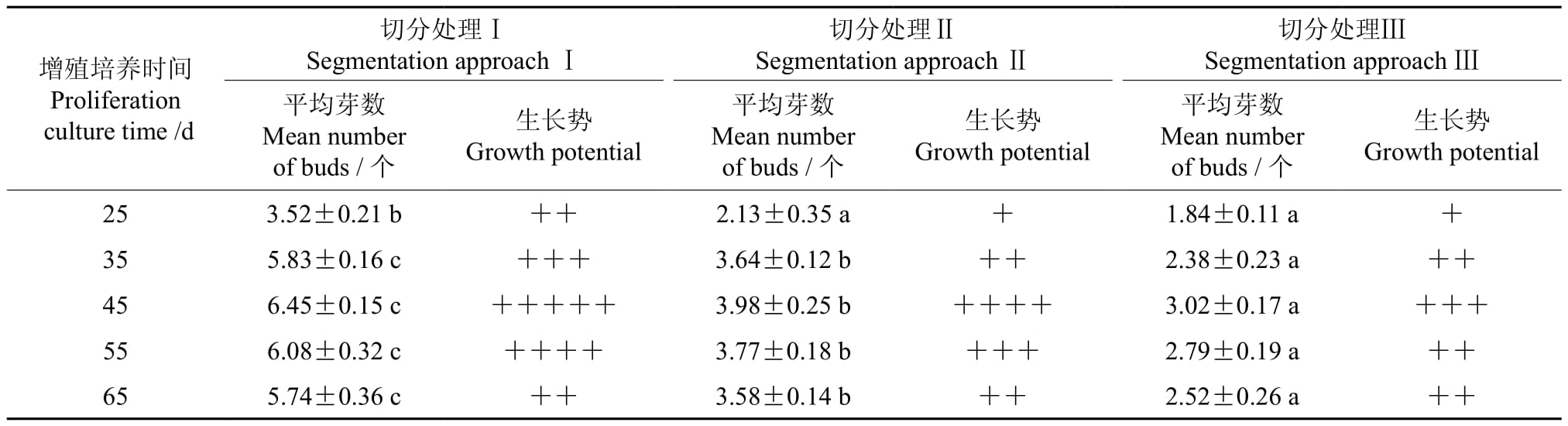 表2 增殖培養(yǎng)時(shí)間及切分處理方式對(duì)多花黃精根莖芽增殖的影響?