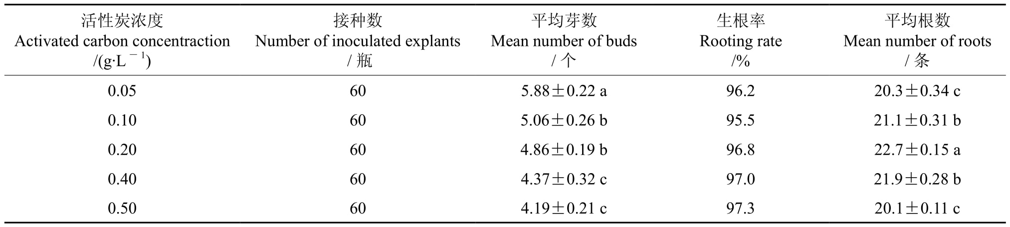 表4 含有不同濃度活性炭的培養(yǎng)基對(duì)多花黃精組培苗增殖和生根的影響