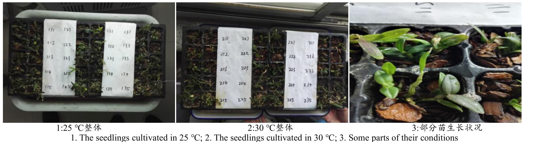 經(jīng)預(yù)實驗發(fā)現(xiàn)一次性澆透水過后,3天之后基質(zhì)干透,需再次澆水,為防止水分過多爛根,水分較少根部枯萎,澆水周期定為3天。每隔十天觀察記錄一次現(xiàn)象,大約3個月之后,對數(shù)據(jù)進行生物統(tǒng)計學(xué)統(tǒng)計,統(tǒng)計出組培苗的成活率和幼苗的生長速率,可得出適宜石斛煉苗的條件和對其影響大的外界因素,從而實現(xiàn)對鐵皮石斛進行的生產(chǎn)培育工作。通過對鐵皮石斛的溫度、培養(yǎng)基質(zhì)、水源等影響因素進行分組處理(表3、4),經(jīng)一年的觀察,以及對出芽時間和數(shù)量的記錄,得出了鐵皮石斛煉苗快恢復(fù)(以分化出第一芽的時間為依據(jù))的培養(yǎng)條件為30℃,⑤號培養(yǎng)基質(zhì)并用光照過的自來水澆灌,第一芽分化的時間只有10 d。但這種條件對于鐵皮石斛日后生長不利,極易會出現(xiàn)枯死、爛根等情況。后期有利于鐵皮石斛生長(以植株長勢及后出芽總數(shù)為依據(jù))的培養(yǎng)條件是25℃,③號培養(yǎng)基質(zhì)。水質(zhì)方面,自來水與光照過的自來水效果差不多,但均優(yōu)于去離子水。在此條件下幼苗全部存活并且長勢良好,澆水次數(shù)方便人工管理,適合大面積煉苗(圖3)。