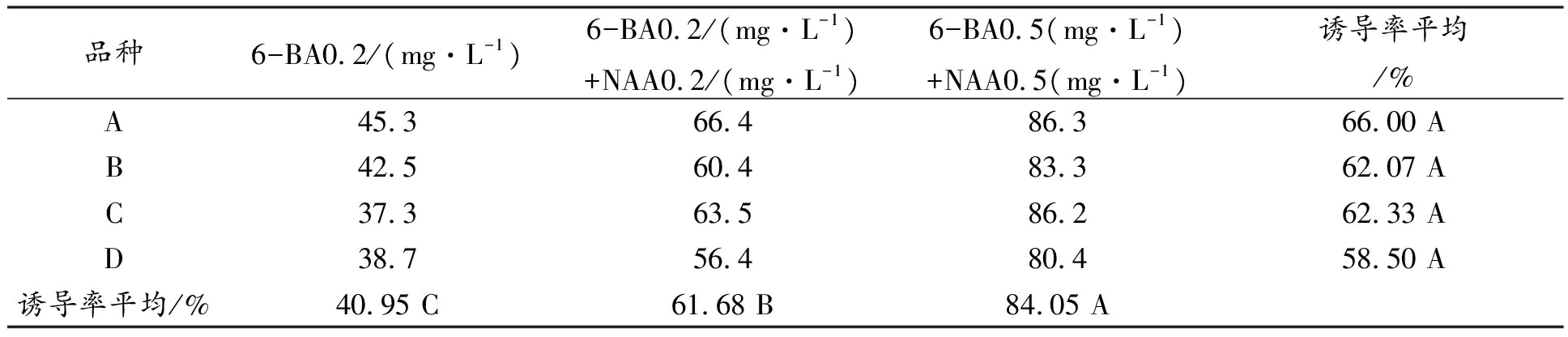 表1 不同激素配方對(duì)四種礬根初代培養(yǎng)誘導(dǎo)率的影響