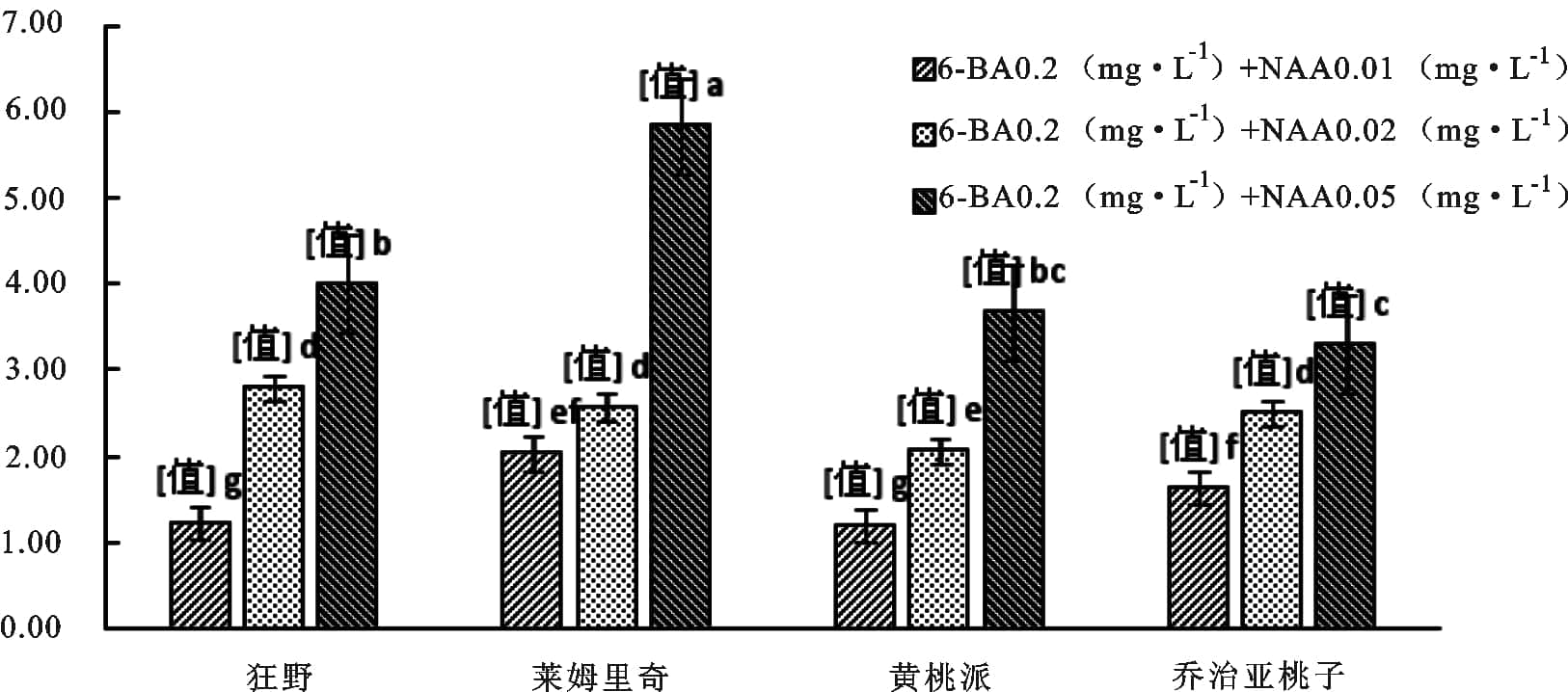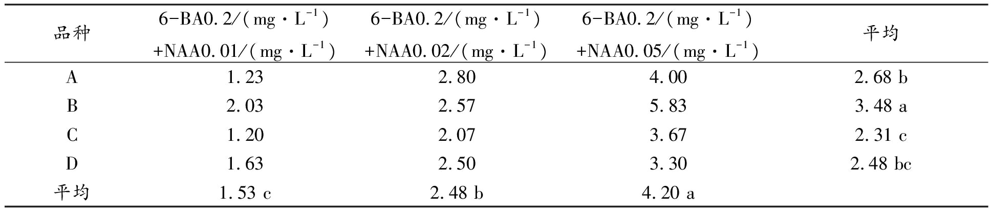 統(tǒng)計(jì)分析結(jié)果發(fā)現(xiàn),品種與激素之間的互作差異顯著,進(jìn)一步分析兩因素的互作效應(yīng),其中B品種萊姆里奇采用6-BA0.2 mg·L-1 +NAA 0.05 mg·L-1的誘導(dǎo)率最高,可達(dá)5.83,C品種“黃桃派”采用6-BA0.2 mg·L-1 +NAA0.01 mg·L-1的誘導(dǎo)效果最差,分析結(jié)果見(jiàn)圖3。