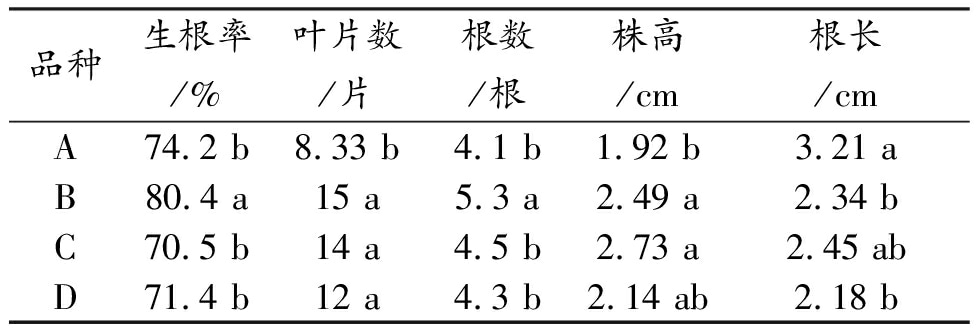 表3 四個(gè)礬根品種組培生根誘導(dǎo)情況