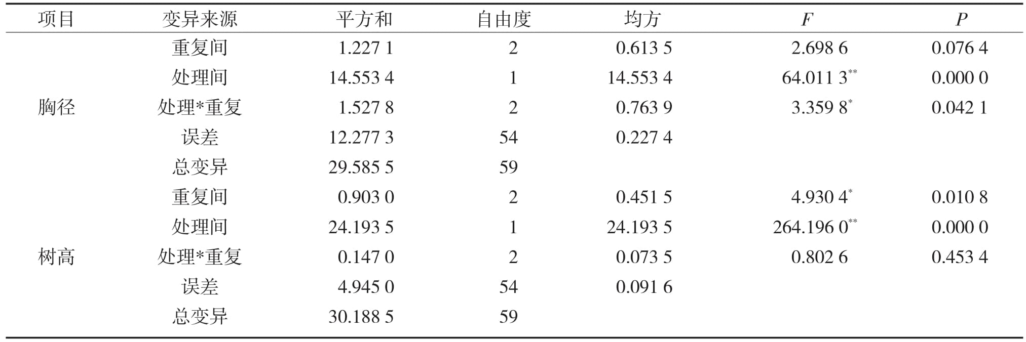 表2 大花序桉組培苗和實(shí)生苗胸徑和樹高方差分析