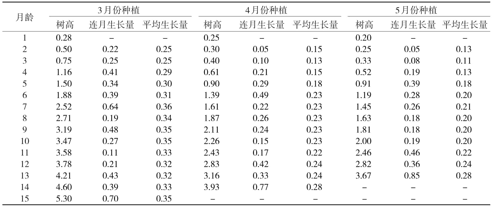 由表3可知:在相同的生長(zhǎng)周期即同為12個(gè)月齡時(shí),3、4、5月份種植的大花序桉組培苗幼林林分平均樹高分別為3.78、2.83、2.82 m,且在這個(gè)周期內(nèi)的樹高月平均生長(zhǎng)量分別為0.32、0.24、0.24 m。3月份種植的林分樹高生長(zhǎng)量大于4、5月份種植的林分,且隨著林齡增長(zhǎng),林分樹高生長(zhǎng)優(yōu)勢(shì)一直保持。3、4、5月份種植的大花序桉組培苗林分樹高連月生長(zhǎng)量趨勢(shì)基本一致,造林當(dāng)年8月施肥后,在9月時(shí)樹高連月生長(zhǎng)量均達(dá)大,分別為0.64、0.49、0.39 m。3月份種植的大花序桉組培苗林分在造林當(dāng)年10月遭受臺(tái)風(fēng)影響后樹高連月生長(zhǎng)曲線出現(xiàn)較大波動(dòng),而4月份和5月份種植的大花序桉組培苗林分受臺(tái)風(fēng)影響不大。3、4、5月份種植的大花序桉組培苗幼林在第2年4月施肥后,均表現(xiàn)出較強(qiáng)的高生長(zhǎng)趨勢(shì)。