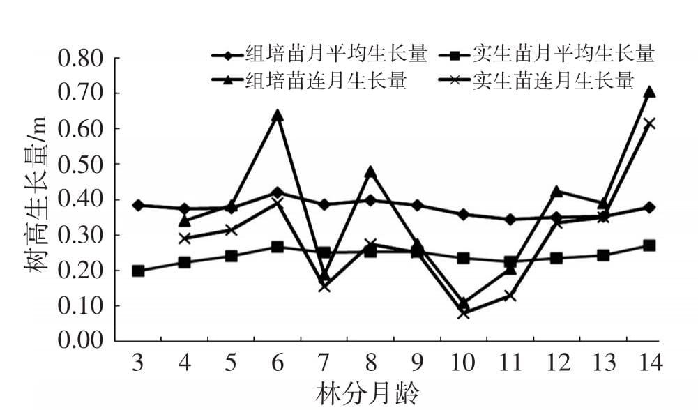 2.2 大花序桉組培苗和實(shí)生苗林分的樹高連續(xù)生長(zhǎng)比較分析