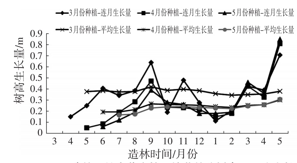 圖3 不同造林月份大花序桉組培苗林分樹高月平均生長(zhǎng)量和連月生長(zhǎng)量變化