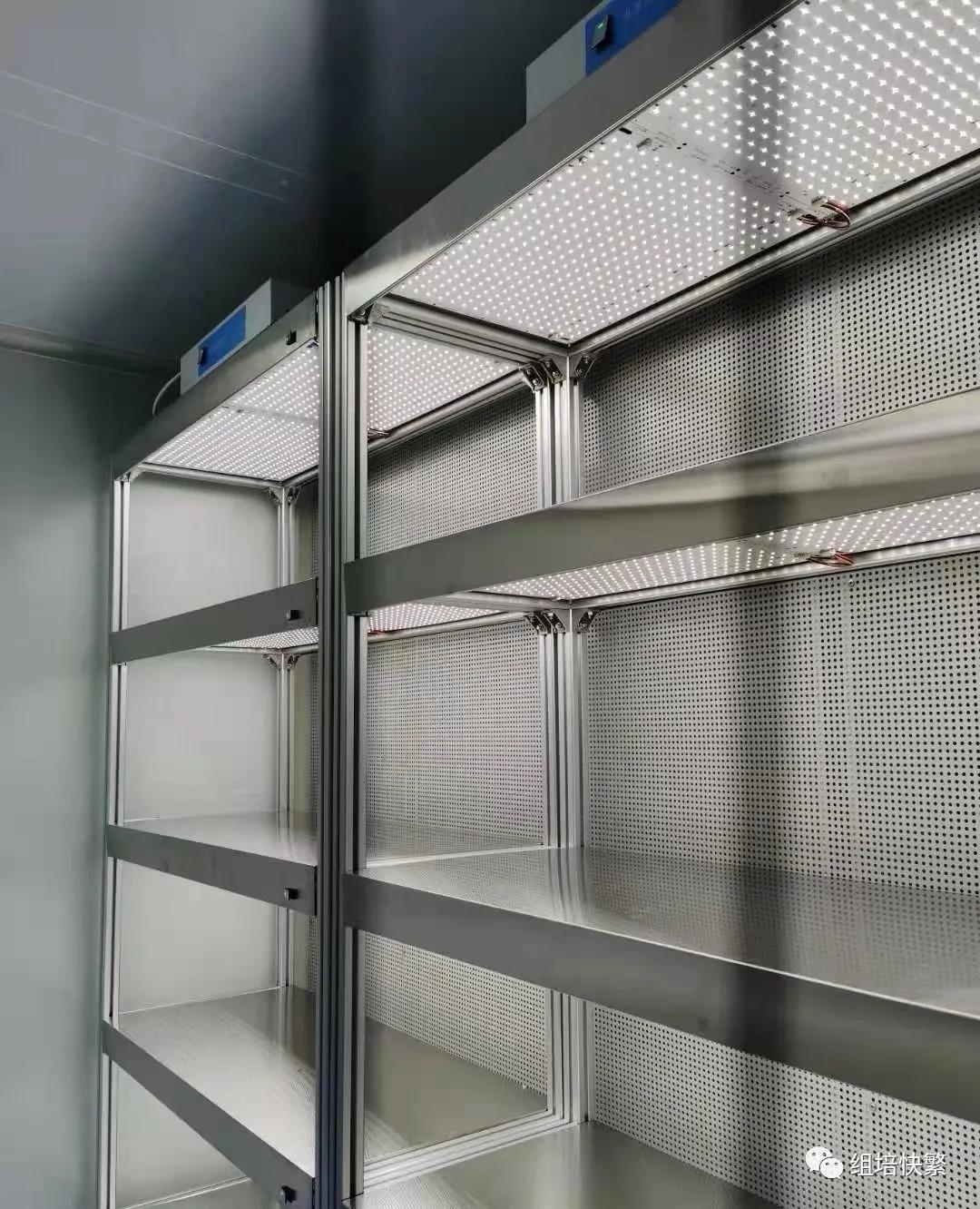 采用歐標鋁型材作為整體框架主材料,立柱規(guī)格:40×40*2mm,表面電泳處理。耐腐蝕。表面光潔度高,無毛刺,無需二次加工。每層置物板下方配備LED植物專用生長光源,使用壽命長,節(jié)能,光照均勻性好。置物板配備鏡面不銹鋼,耐腐蝕。每層置物板高度調(diào)節(jié)由四個角的滑塊連接件進行松緊調(diào)節(jié),無需額外螺絲孔,表面干凈,美觀,無毛刺不割手。置物板前部設(shè)有遮光系統(tǒng),可以有效防止光照的逃逸從而造成實驗人員的刺眼等損傷。每層置物板的右側(cè)配備主光、輔光調(diào)光器,弱電,DC24V,供電安全。